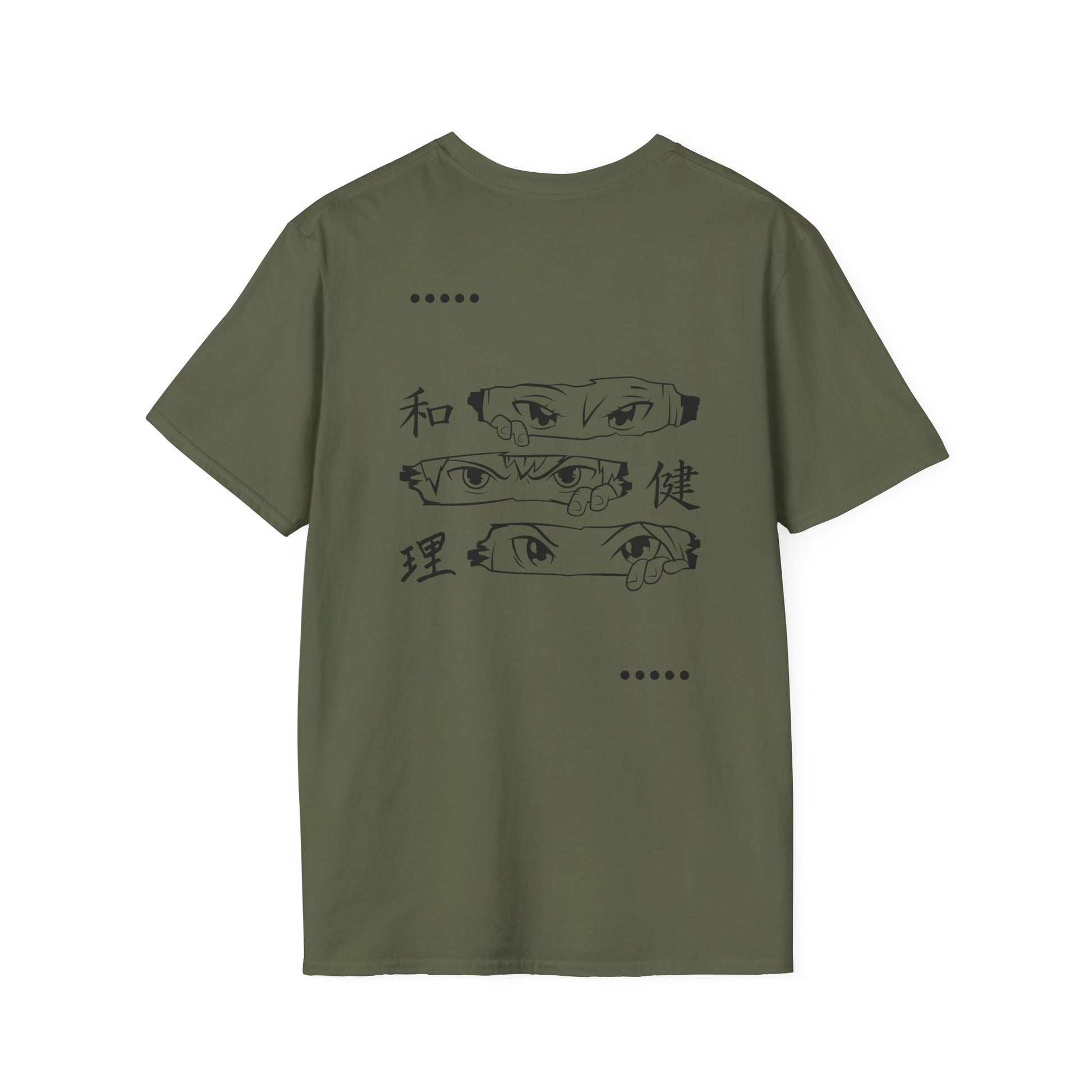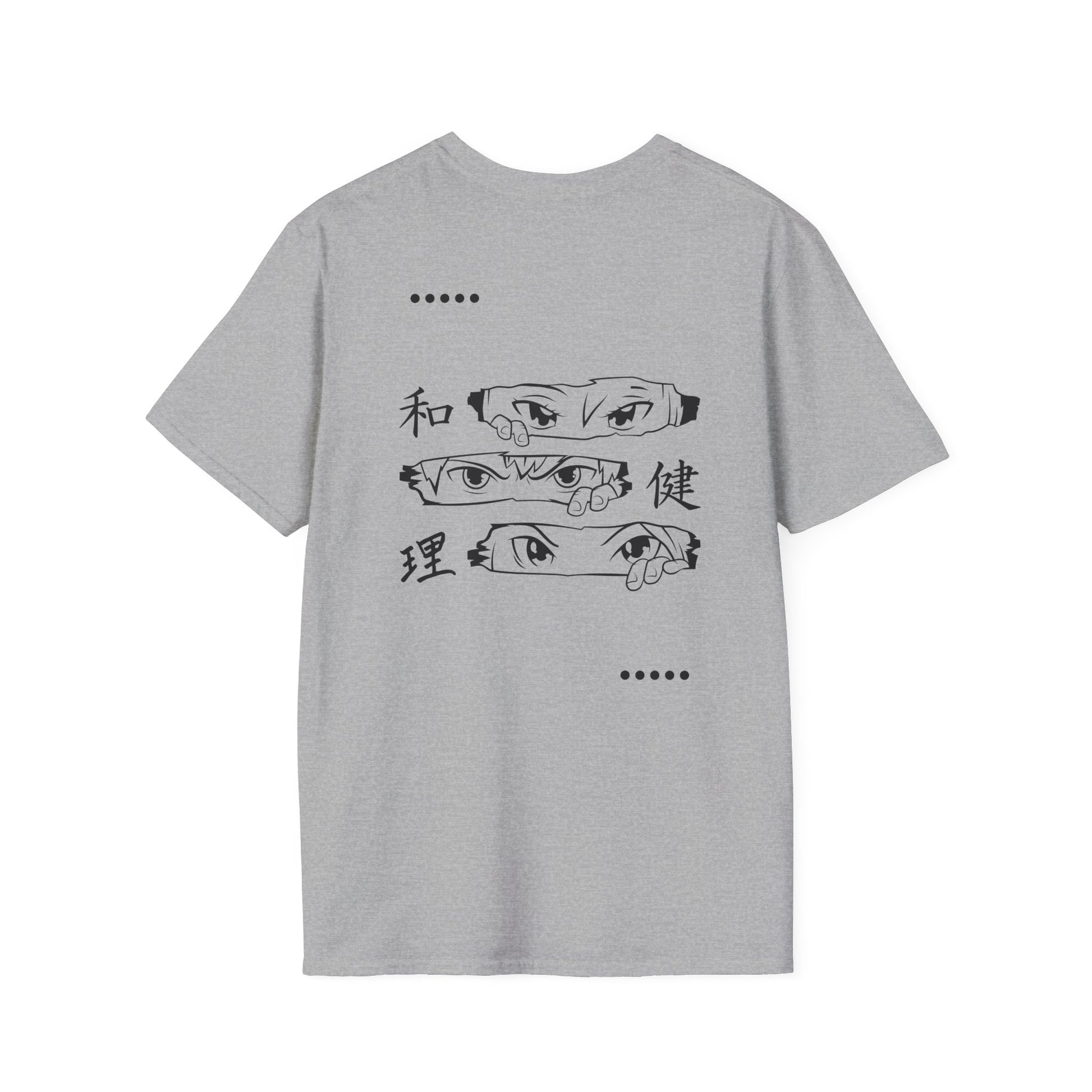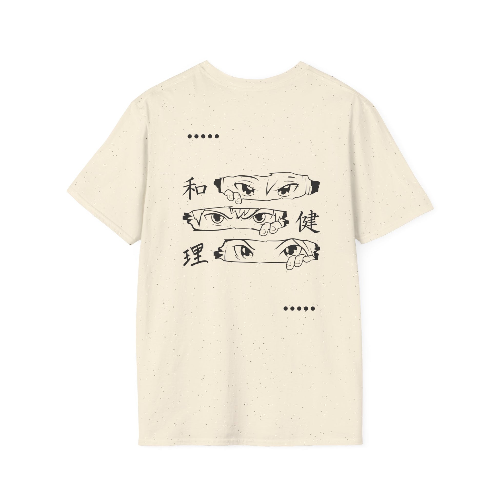 A clean, lightweight tee that reads like a sketchbook page brought to life. Thin, expressive manga-style eyes peek through torn paper slashes across the front and back, framed by delicate Japanese characters — a quiet, introspective design for someone who prefers subtle storytelling over loud logos. The soft ring-spun cotton feels breathable against the skin; the tubular knit and ribbed collar keep the silhouette smooth and unfussy. Wear it layered under a jacket for late-night city walks or as a statement piece at casual meetups where art and mood matter more than trends.