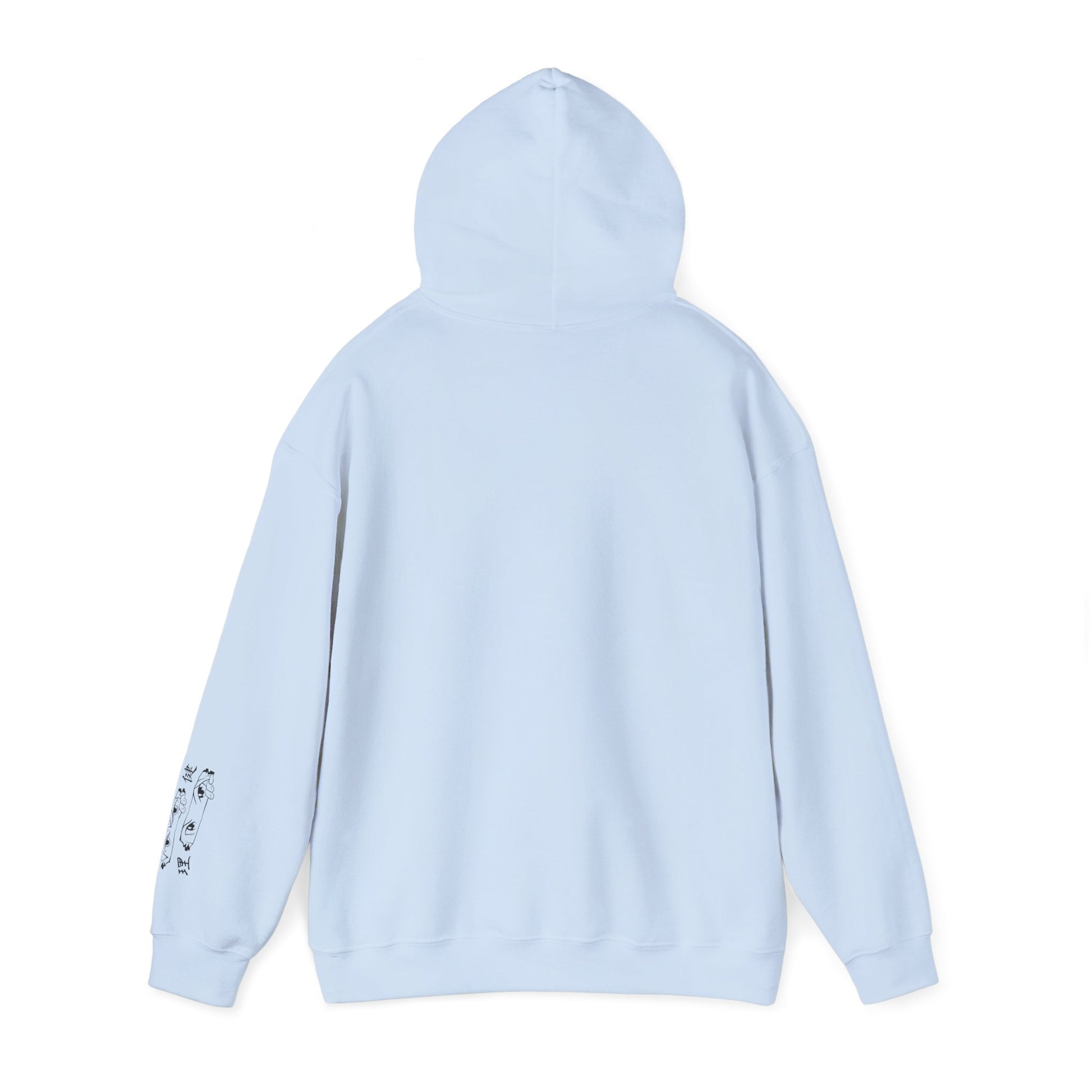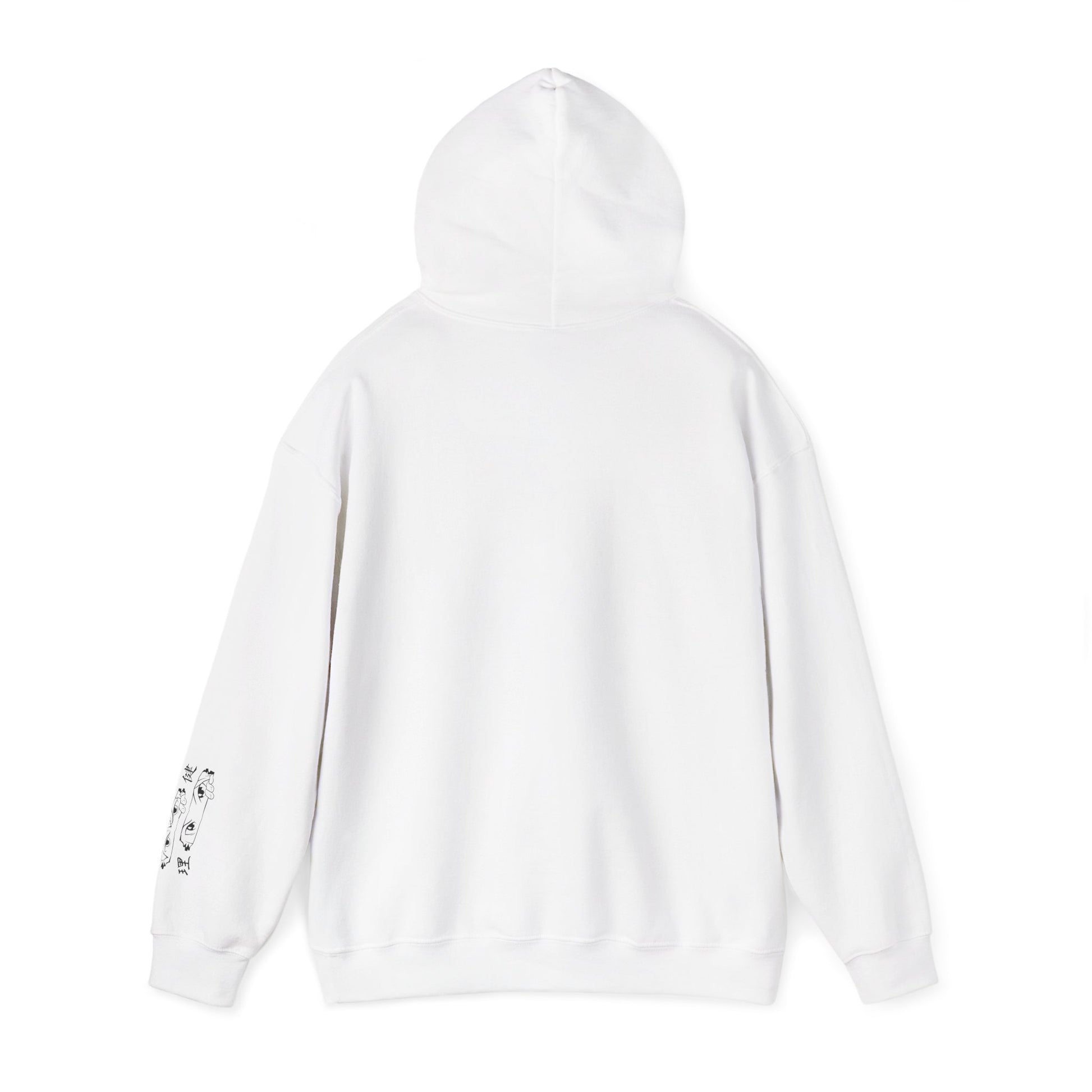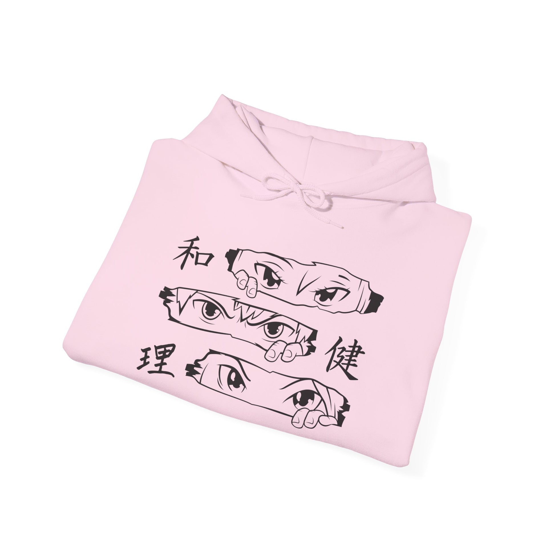 A soft, mid-weight hoodie with a calm, minimalist anime-inspired design that reads like a quiet moment from a manga panel. Three horizontal slits reveal focused, expressive eyes; delicate kanji characters sit beside each panel, adding subtle context and a touch of East-Asian calligraphic grace. The white background keeps the composition clean so the black line-art stands out—wear it layered for slow mornings, evening walks, or study nights when you want to feel composed and a little mysterious. The roomy kangaroo pocket and adjustable hood make it easy to carry a sketchbook, headphones, or warm your hands between classes. This hoodie blends everyday comfort with a niche visual language for fans who prefer understated, story-driven apparel rather than loud logos.